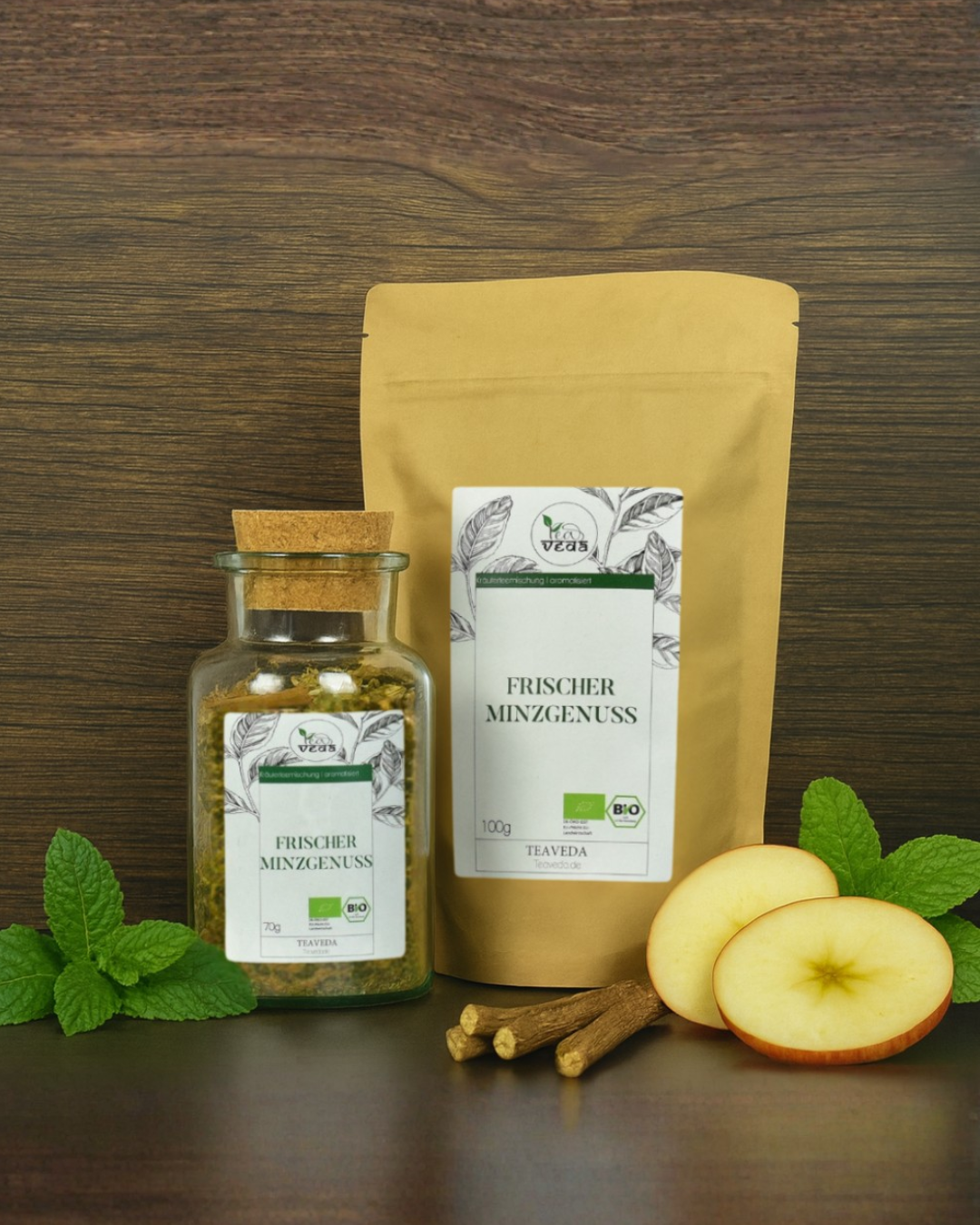 Unser Frischer Minzgenuss Tee ist eine erfrischende Brise für die Sinne. Hergestellt aus einer ausgewogenen Mischung von Süßholzwurzel, Apfelstücken, Pfefferminze und Zitronengras, bietet dieser Tee eine harmonische Kombination aus erlesenen Zutaten.
